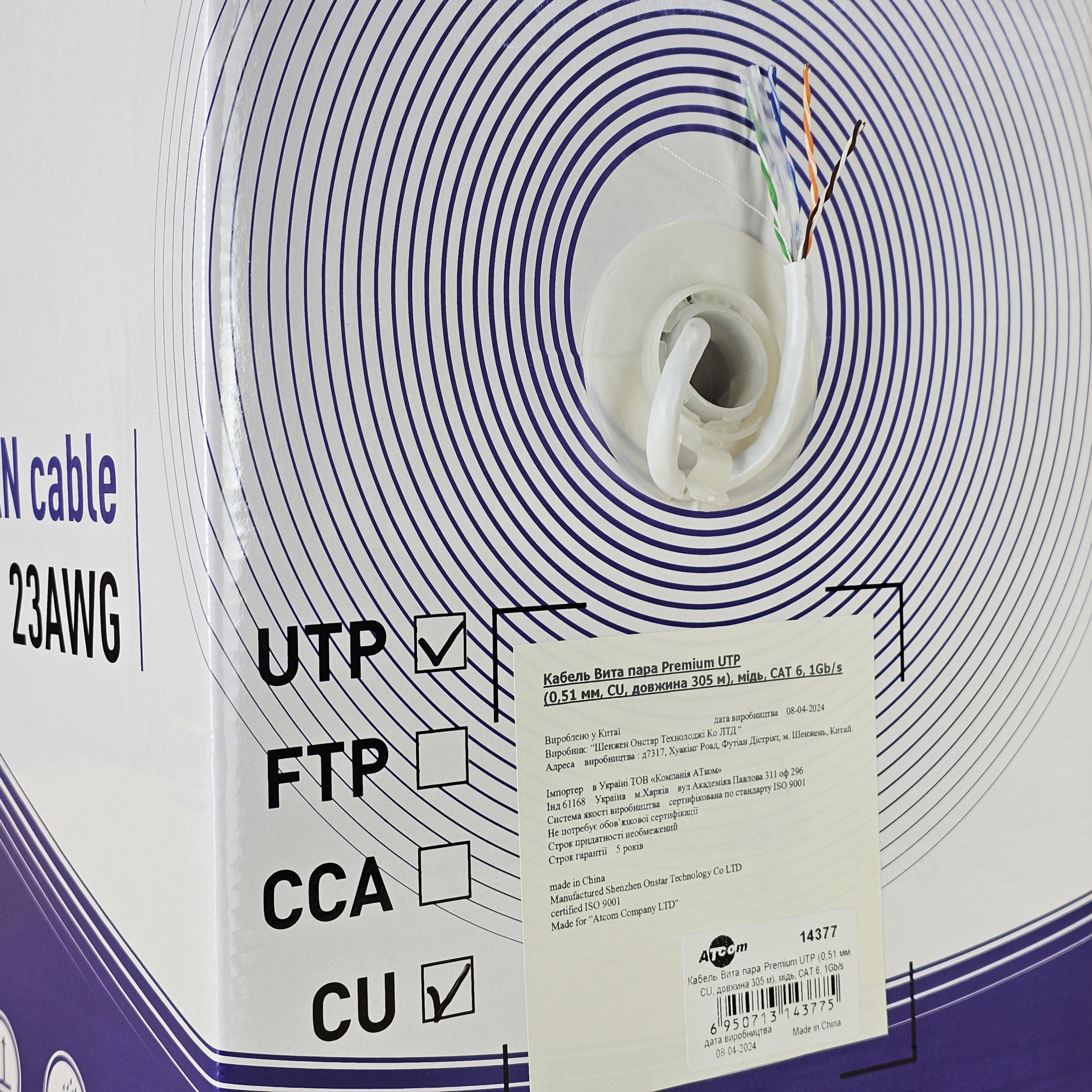 Основные характеристики кабеля ATcom UTP Cat6 Premium Cu (14377):